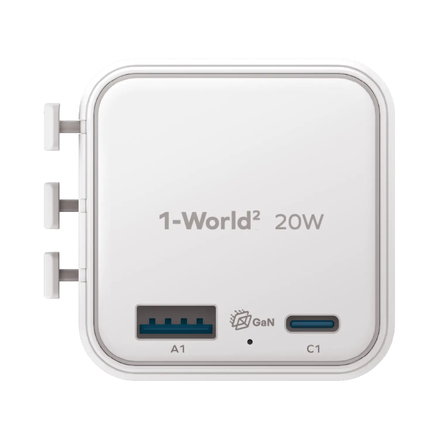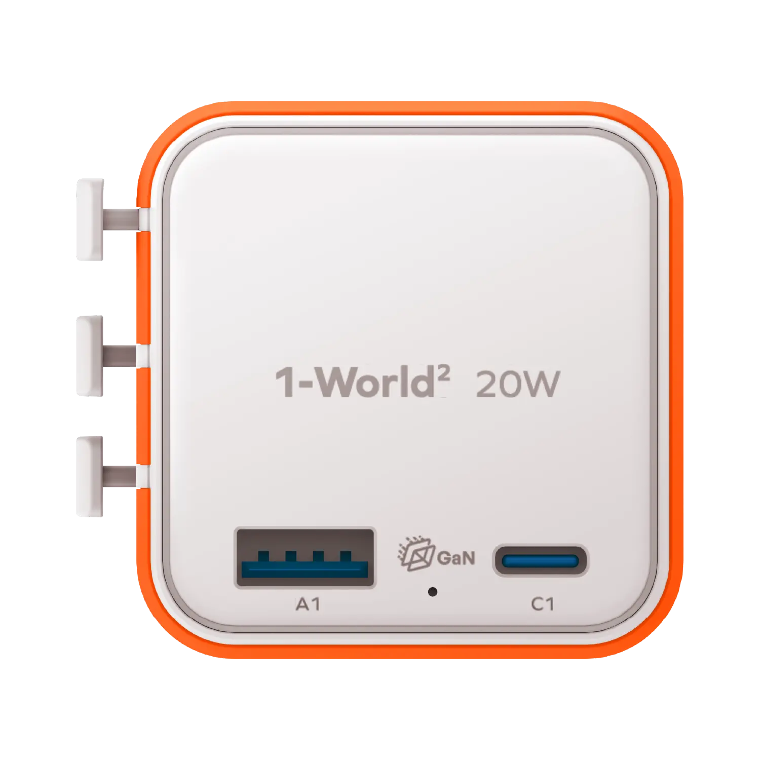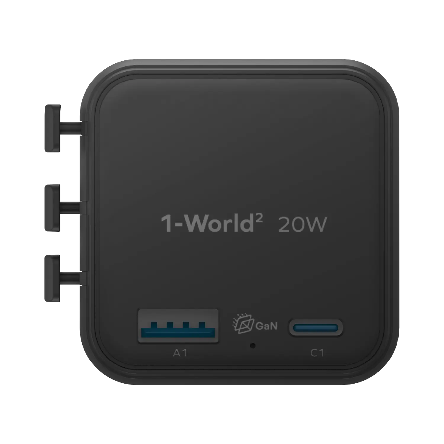 1-World² 2-Port USB-A and USB-C GaN Travel Charger 20W