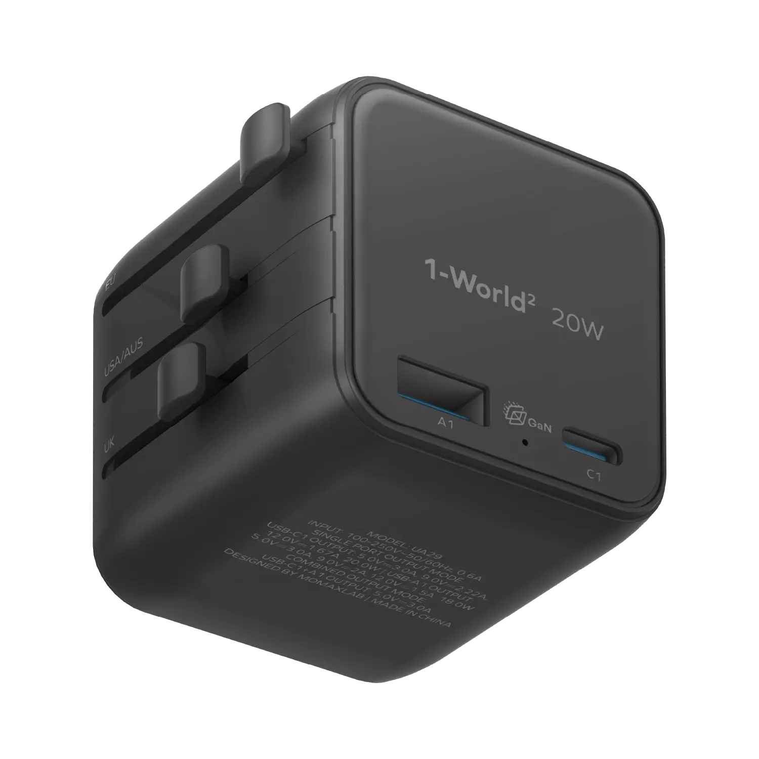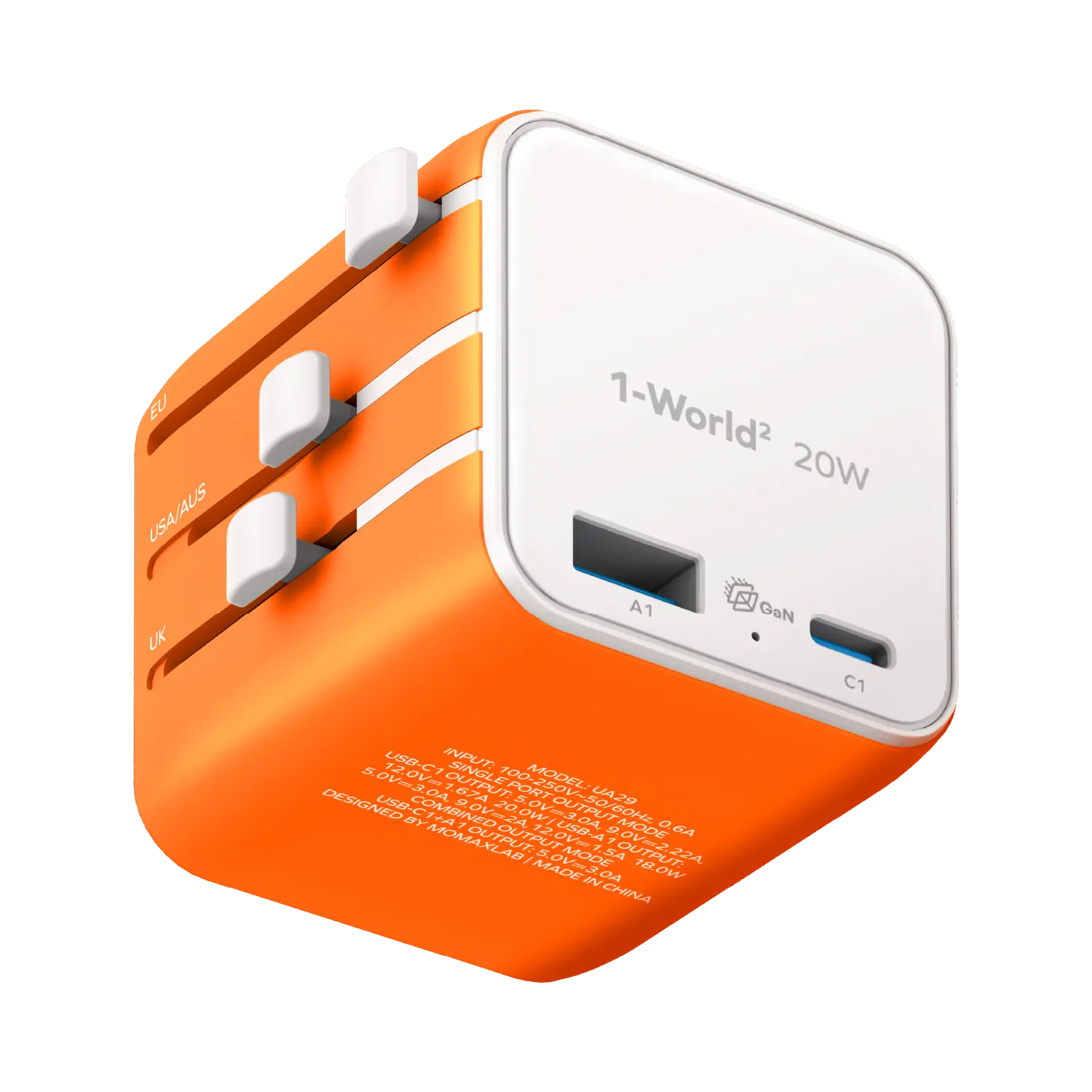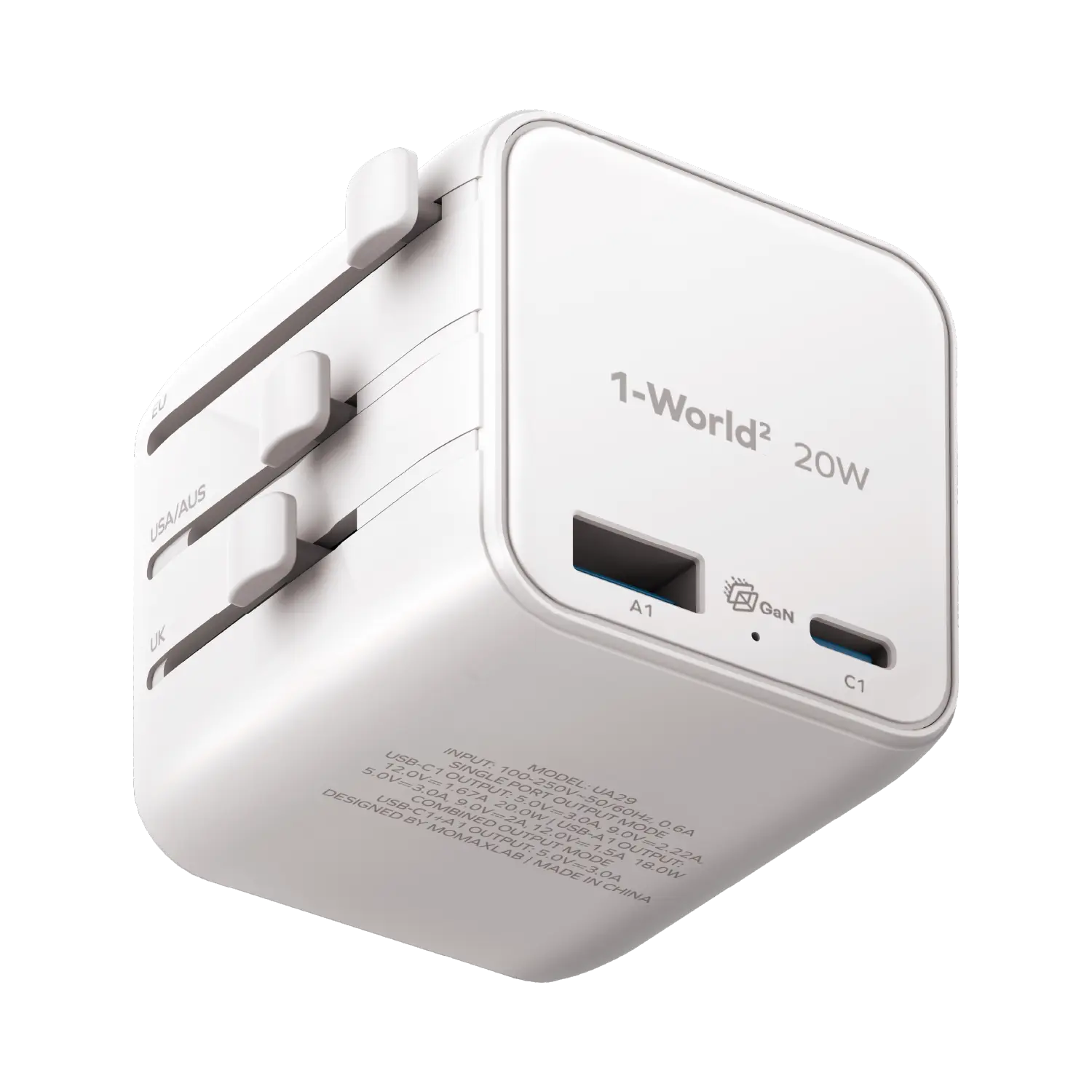 1-World² 2-Port USB-A and USB-C GaN Travel Charger 20W